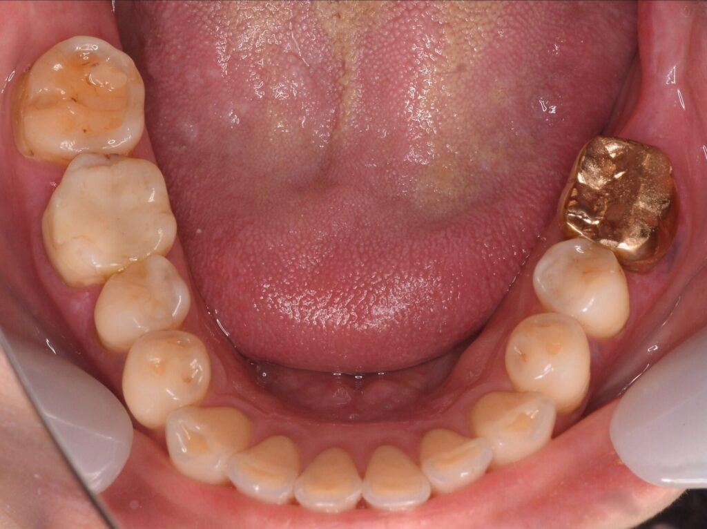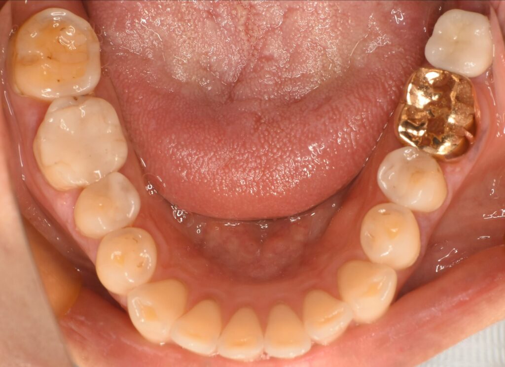 | 治療方法 | 残すことは無理と判断し抜歯を行い、インプラント手術を行いました。その後、インプラントと骨が結合したことをCTで確認をし、被せ物(ジルコニアボンド)の治療をしています。 |